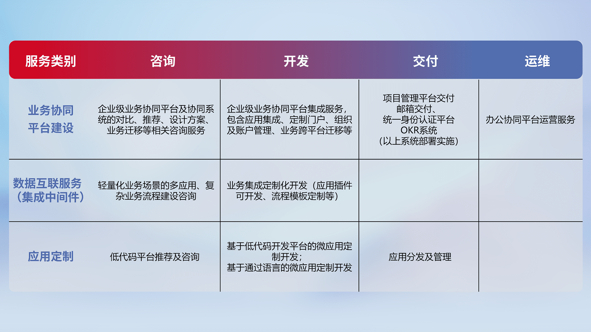 针对钉钉、、、企微、、、、IDaas等平台级产品提供产品的规划、、、方案、、、交付、、、、定制化开发等服务,,,实现如统一协同办公、、智能客户服务、、、、混合会议管理、、、、智能数据查询、、、等业务场景,,,实现数字化转型。。。。