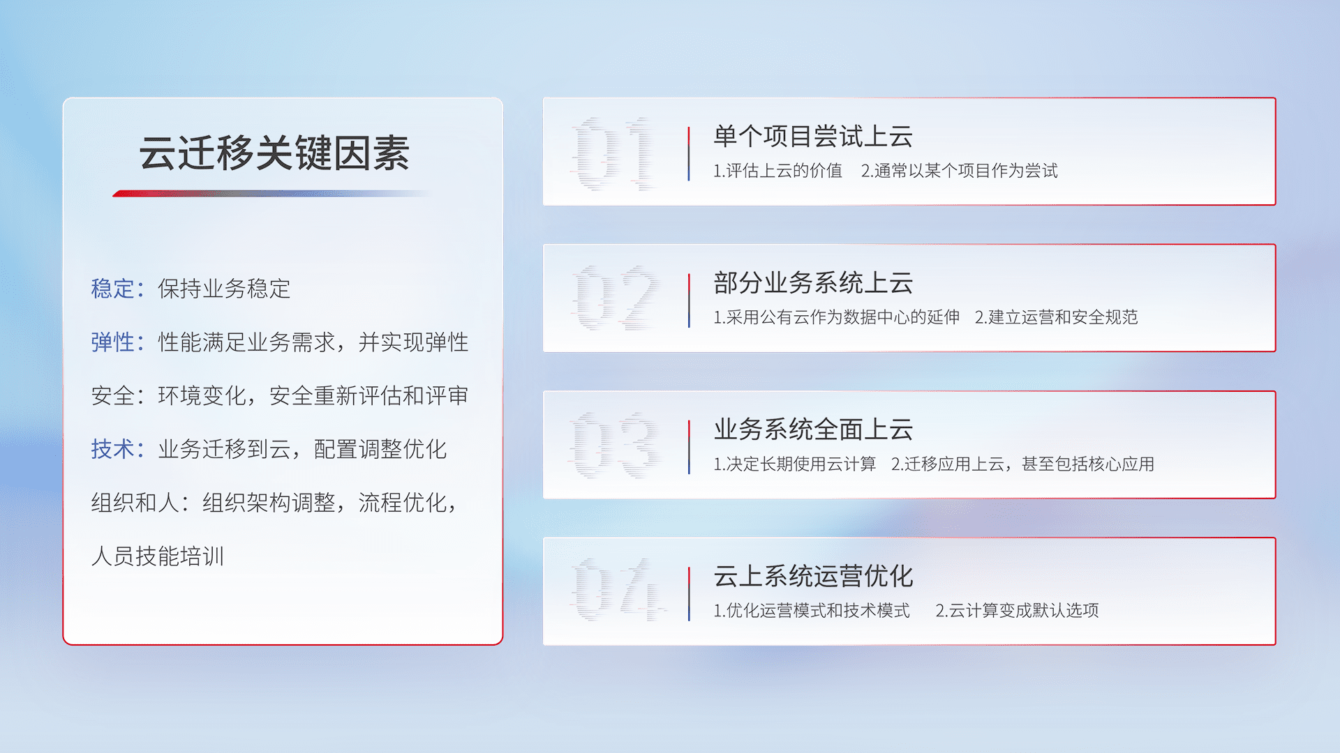 结合实际业务,,,从规划设计、、云平台选型、、、、云原生改造、、、数据迁移、、集成交付,,,,迁移全过程为客户识别最佳上云路径,,做好风险识别管理,,设计网络架构、、、、身份权限、、、安全审计合规、、、操作审计、、日志审计、、、、监控告警策略、、、多站点容灾设计等,,,,对云上基础设施进行整体规划,,,提升IT治理水平,,以满足弹性、、高可用、、、高性能的需求。。